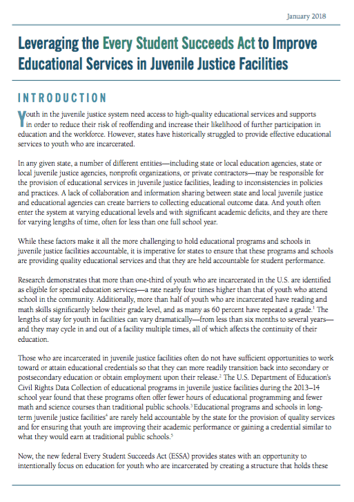 This brief provides state and local policymakers, as well as education and juvenile justice leaders, with information about how they can use requirements under the Every Student Succeeds Act (ESSA) to improve education and workforce outcomes for youth in long-term juvenile justice facilities. The brief: